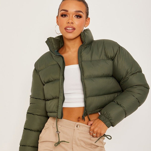 Women S Olive Green Cropped Puffer Jacket Kosmo